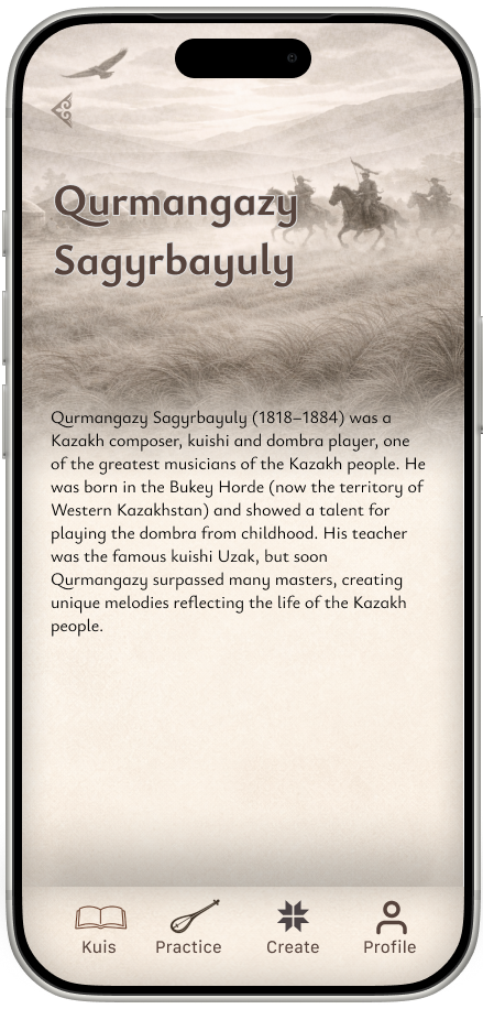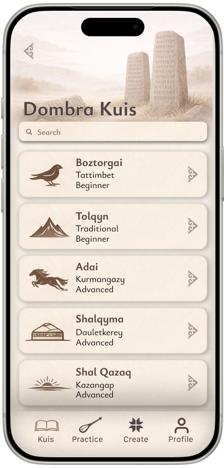 Растущая платформа для изучения, практики и совершенствования традиционной казахской музыки на домбре — уходящая корнями в наследие и созданная для сегодняшних музыкантов.